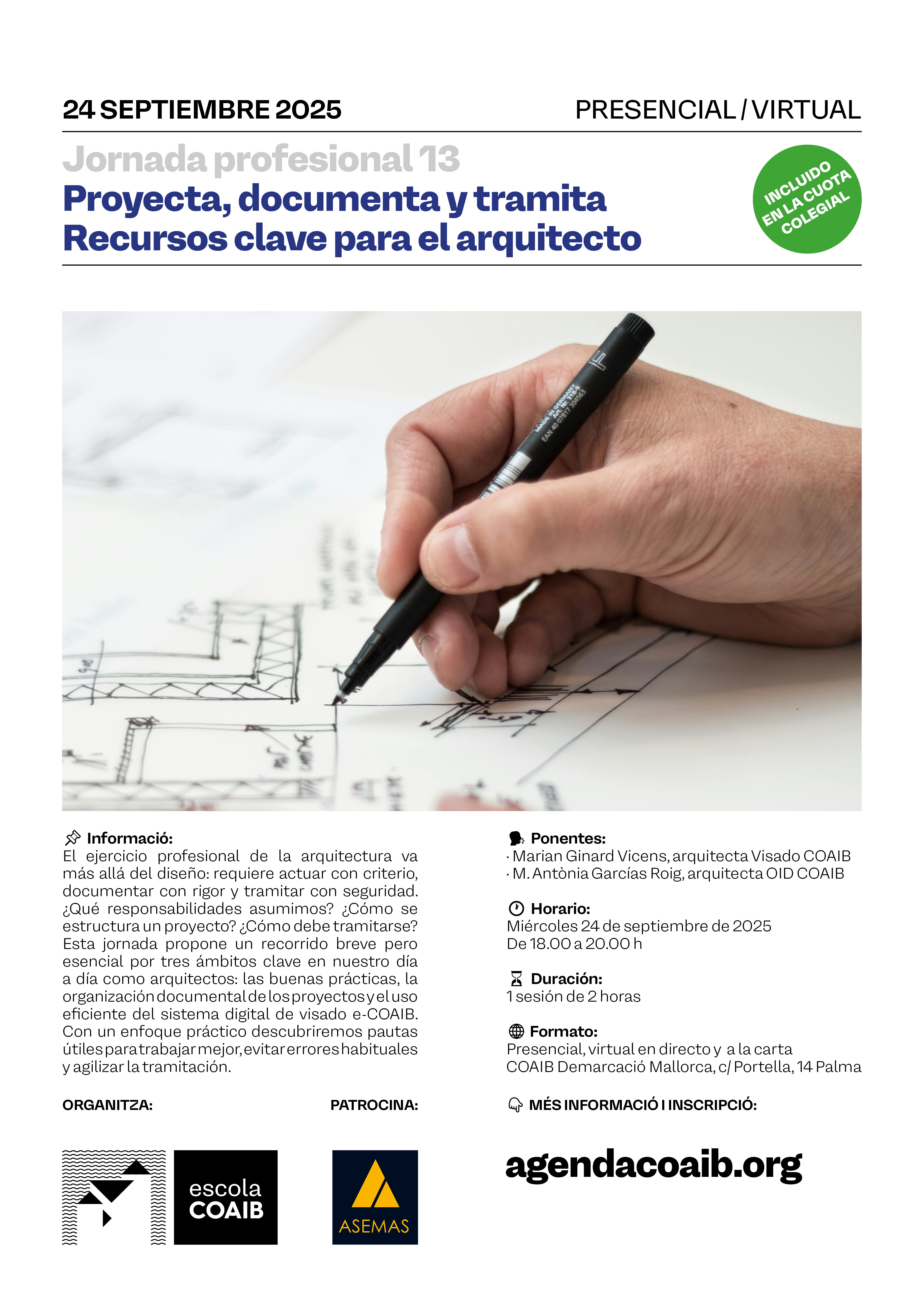 L’exercici professional de l’arquitectura va més enllà del disseny, cal actuar amb criteri, documentar amb rigor i tramitar amb seguretat. Quines responsabilitats assumim? Com s’ha d’estructurar un projecte? Com s’ha de tramitar? Aquesta jornada proposa un recorregut breu però essencial per tres àmbits clau del nostre dia a dia professional: les bones pràctiques, l’organització documental dels projectes, i l’ús eficient del sistema digital de visat e-COAIB. Amb un enfocament pràctic, descobrirem pautes útils per treballar millor, evitar errors habituals i agilitzar la tramitació.