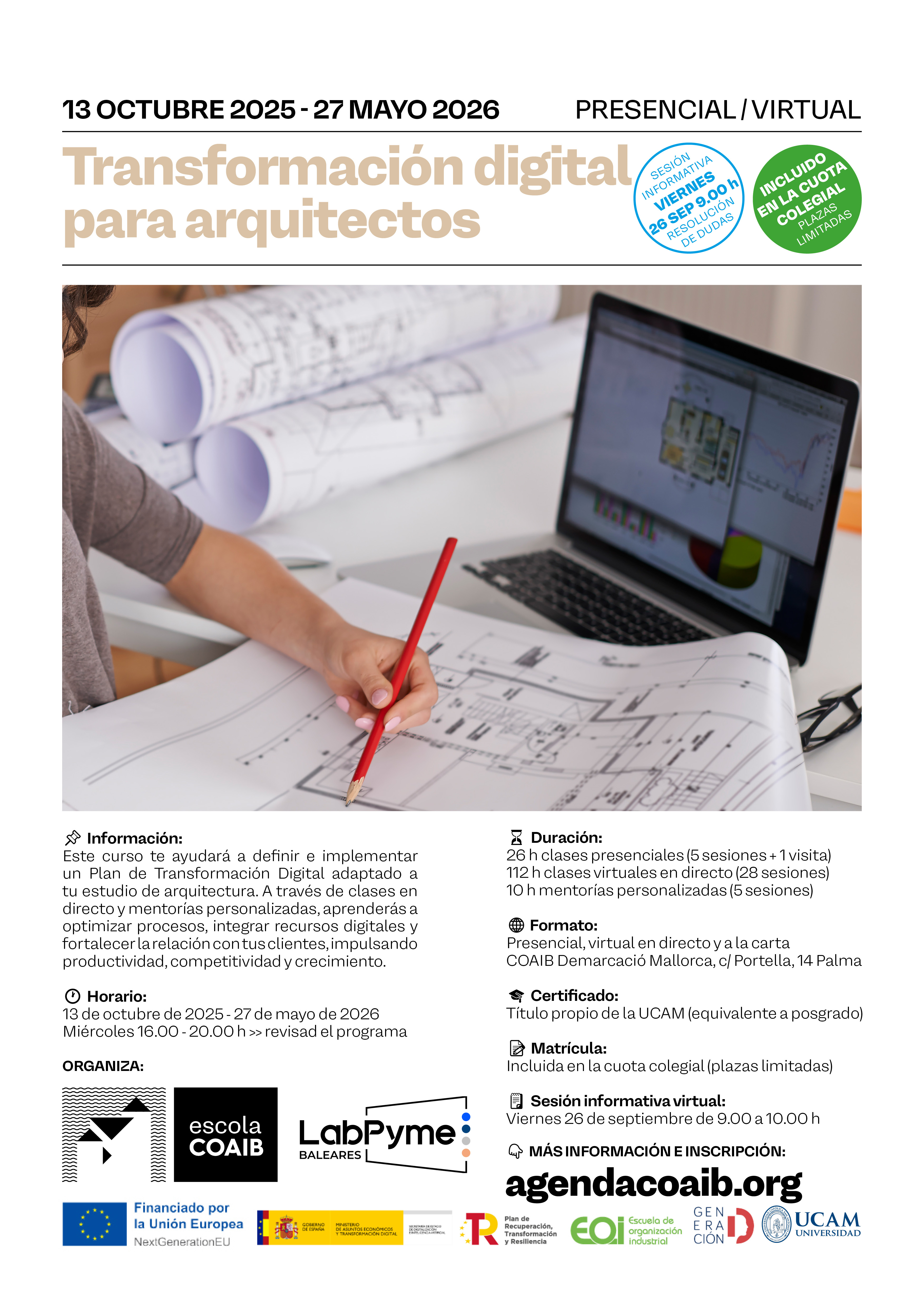 Sessió informativa - Curs Transformació digital per a arquitectes. Curs del 13 d'octubre de 2025 al 27 de maig de 2026. Sessió informativa virtual: Presentació del curs i resolució de dubtes divendres 26 de setembre de 9.00 a 10.00h.