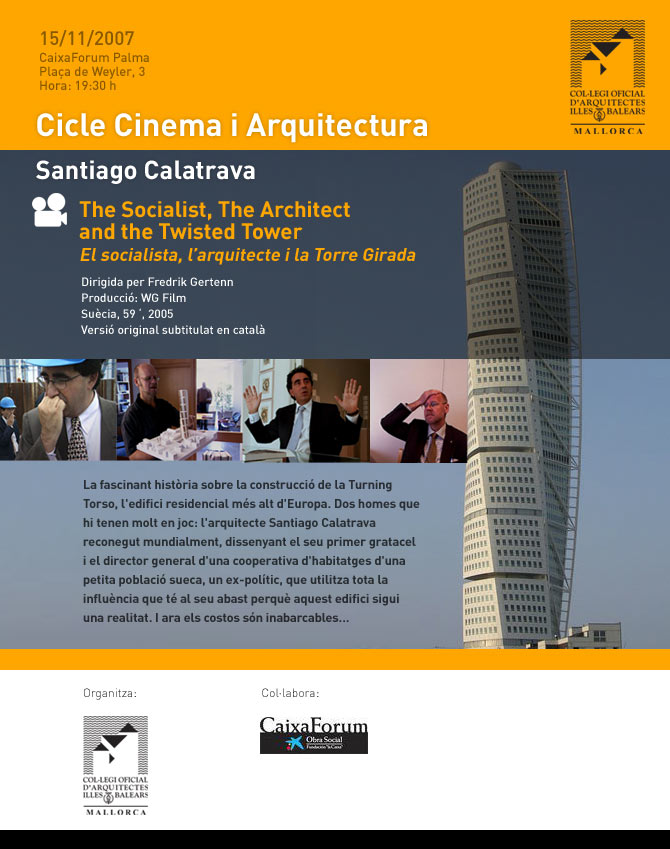 El COAIB organitza la projecció del documental "El socialista, l'arquitecte i la torre girada" (Sossen, arkitekten och det skruvade tornet) que es realitzarà el pròxim dijous, dia 15 de novembre de 2007, a les 19:30 h., al CaixaFòrum de Palma.