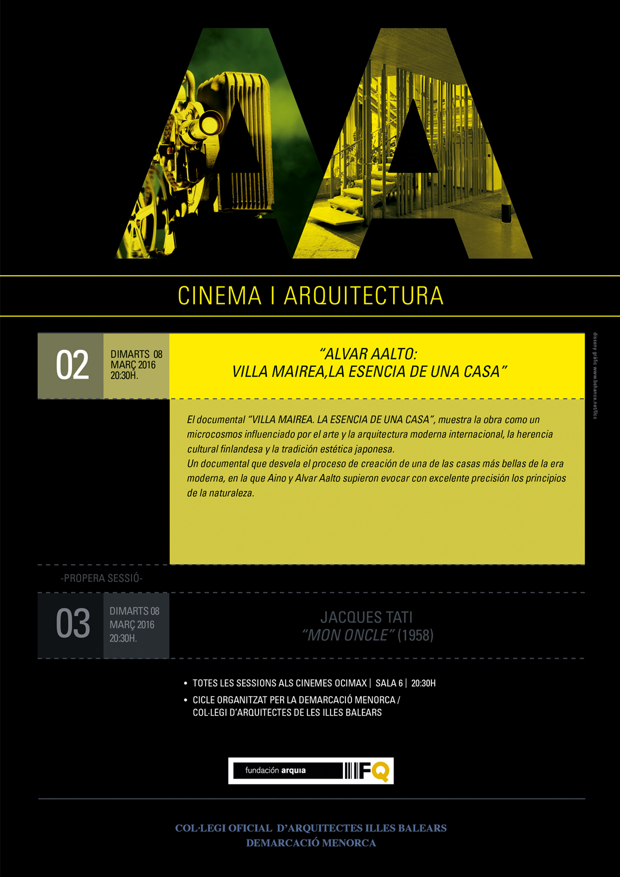 La vocalia de Cultura de la Demarcació Menorca, amb motiu del cicle Cinema i Arquitectura organitza la projecció del documental Alvar Aalto: Villa Mairea, l'essència d'una casa, que se celebrarà el 8 de març de 2016 en el Multisalas Ocimax Maó i que en aquest cicle s'obri a un públic més ampli.