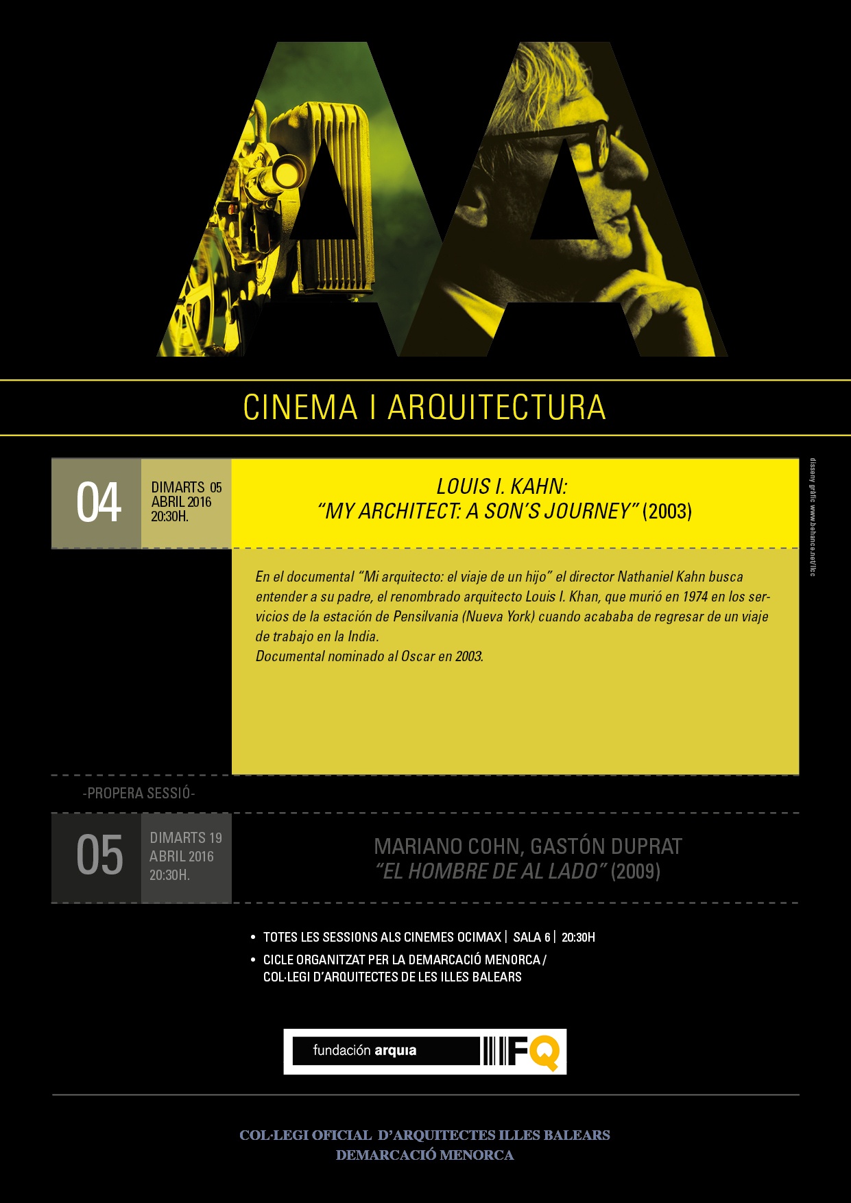 La vocalia de Cultura de la Demarcació Menorca del COAIB, amb motiu del cicle “Cinema i Arquitectura” organitza la projecció del documental: Louis I. Khan: My architect que se celebrarà el 5 d'abril de 2016 en el Multisales Ocimax Maó i que en aquest cicle s'obre a un públic més ampli.