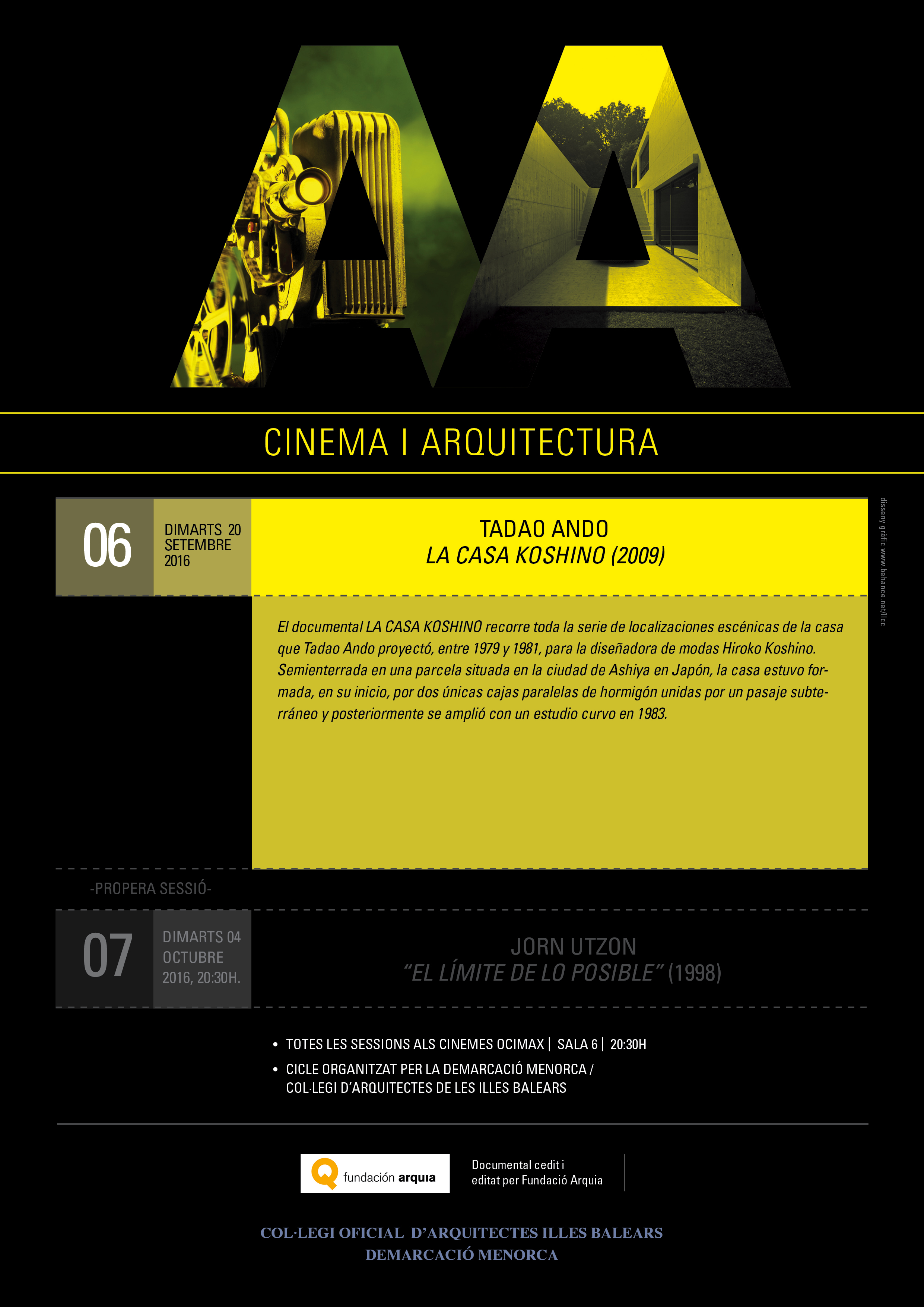 La Vocalia de Cultura de la Demarcació Menorca, amb motiu del cicle Cinema i Arquitectura organitza la projecció del documental Tadao Ando: La casa Koshino (2009) que se celebrarà el 20 de setembre de 2016 en el Multisalas Ocimax Maó i que en aquest cicle s'obre a un públic més ampli.