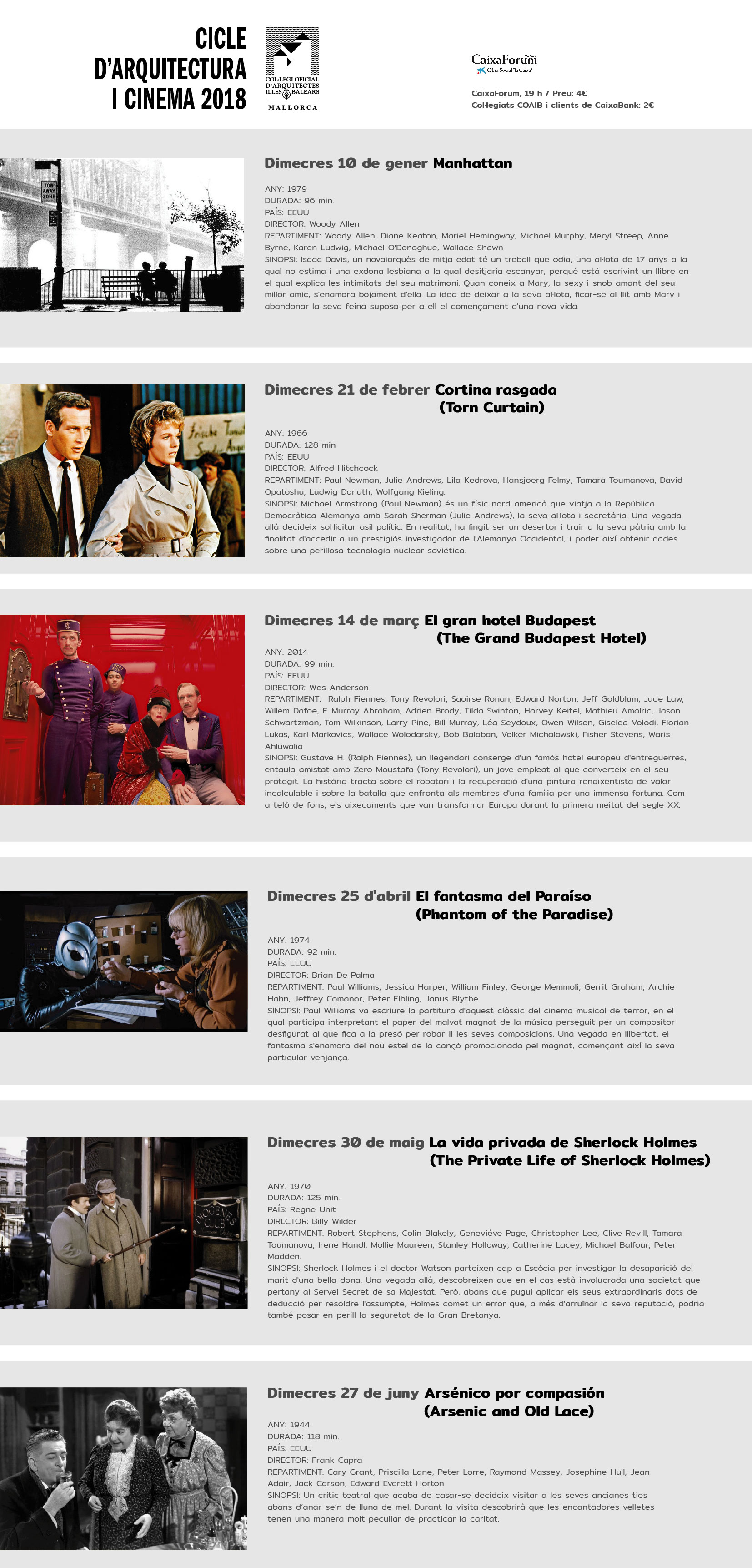 Manhattan, de Woody Allen, proyectada el pasado 10 de enero; Cortina rasgada, de Alfred Hitchcock, el 21 de febrero; El gran hotel Budapest, de Wes Anderson, el 14 de marzo; El fantasma del Paraíso, de Brian de Palma, el 25 de abril; La vida privada de Sherlock Holmes, de Billy Wilder, el 30 de mayo y Arsénico por compasión, de Frank Capra, el 27 de junio.