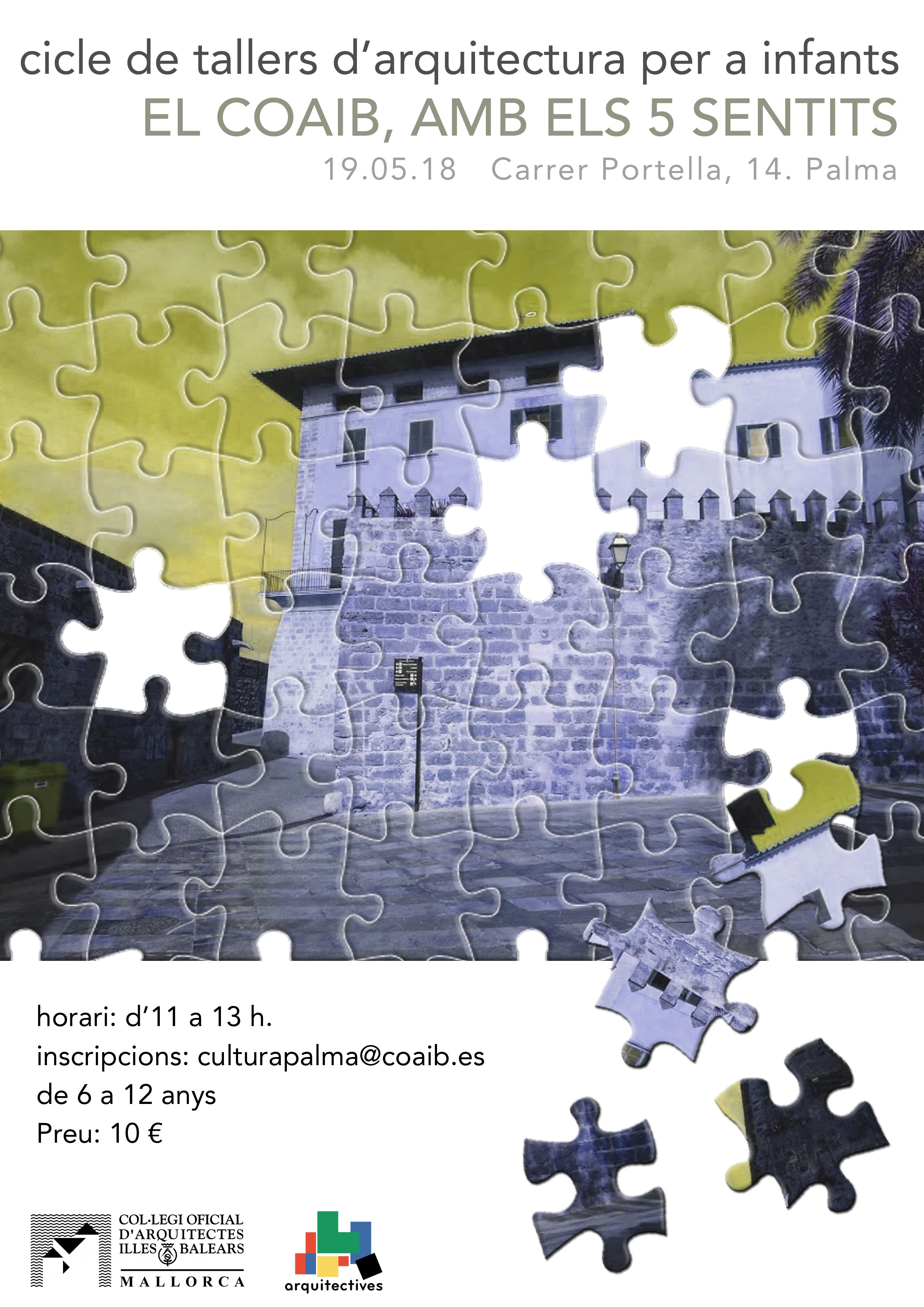 Arquitectives, gabinete formado por los arquitectos Cristina Llorente y Pablo Amor, organiza, con la colaboración de la vocalia de Cultura de la Demarcación Mallorca del COAIB, un taller de arquitectura para niños El COAIB con los 5 sentidos, en el que se investigará el edificio del COAIB desde el punto de vista sensorial, descubriendo sus formas, sombras, sueños, olores y texturas. A manera de gincana, los participantes elaborarán un álbum analítico del Colegio de Arquitectos.