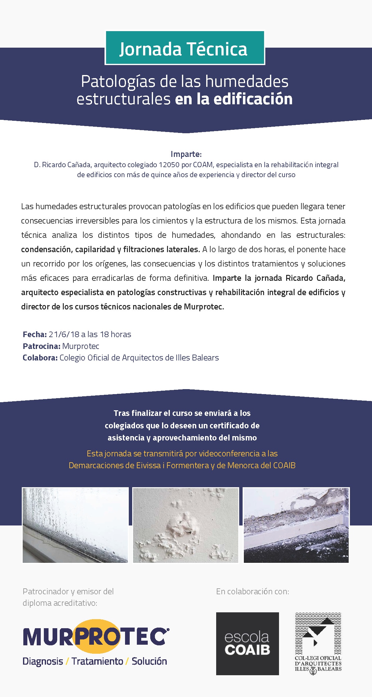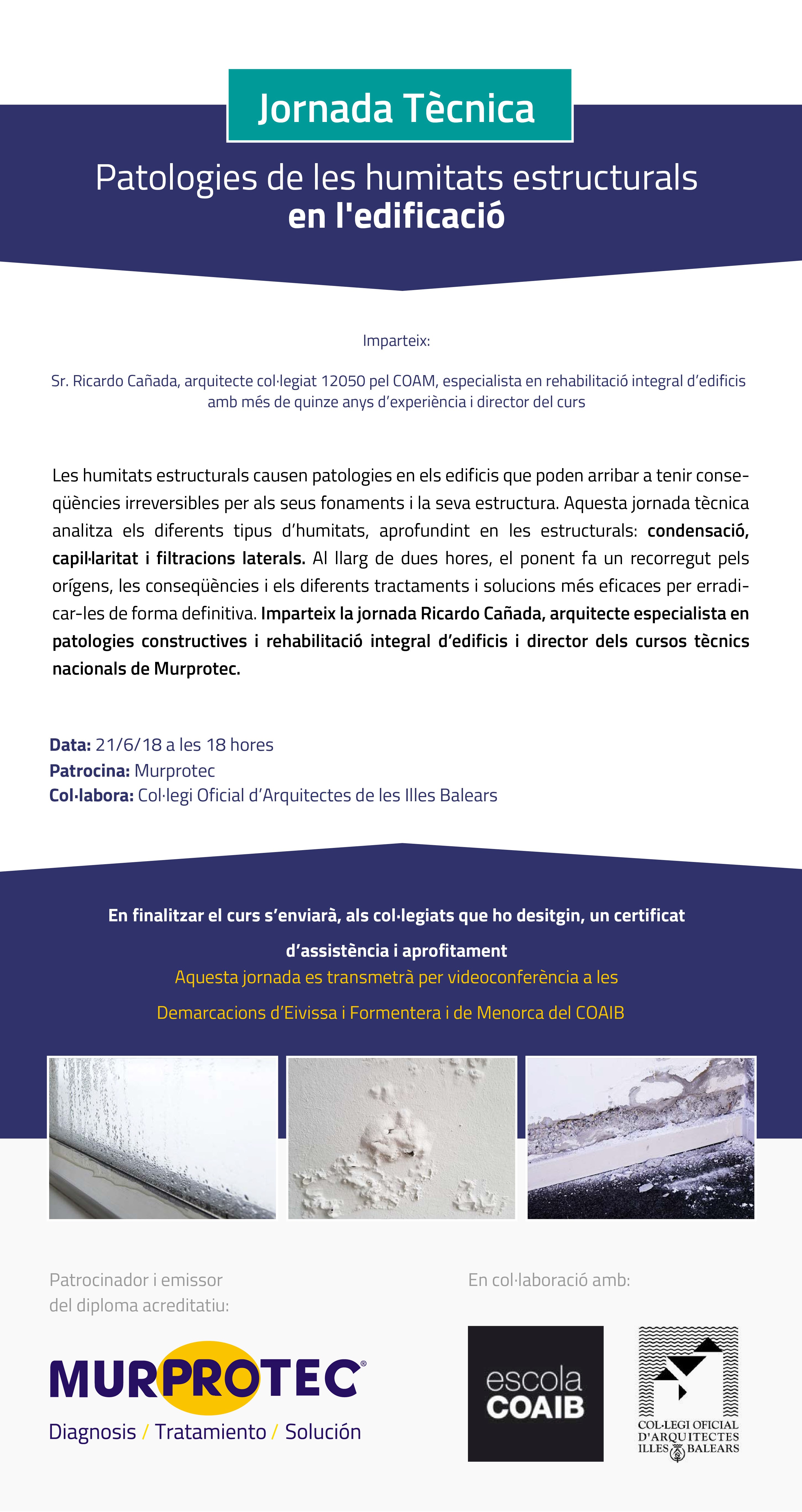 La empresa MURPROTEC organiza, con la colaboración de la Escola COAIB, la jornada técnica Patologías de las humedades estructurales en la edificación, que se celebrará el 21 de junio, de 18:00 a 20:00h, en el salón de actos de la sede central del COAIB (calle Portella, 14 – Palma), y con transmisión por videoconferencia a las Demarcaciones de Eivissa i Formentera y de Menorca del COAIB.