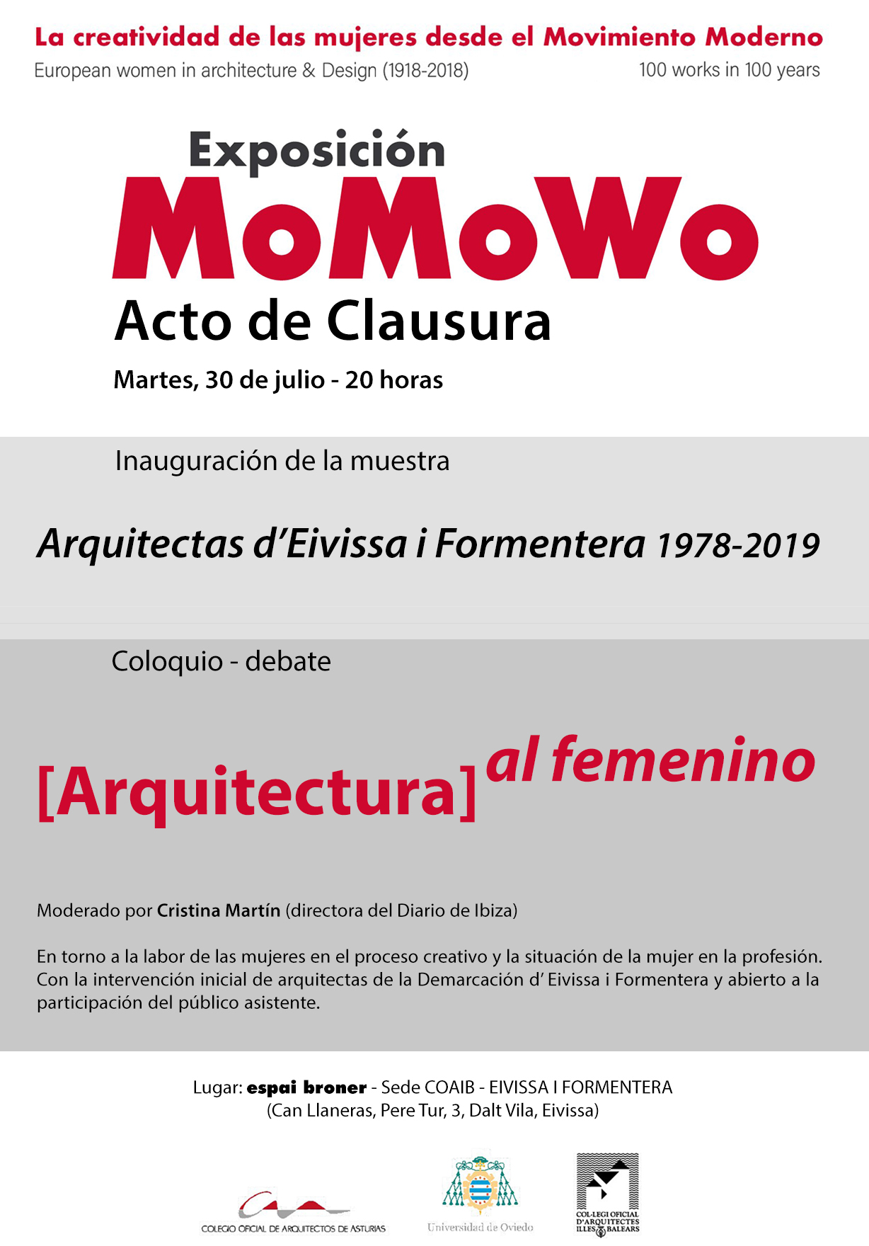 La conciliación en la profesión, las dificultades que encuentra una mujer arquitecta al enfrentarse a un mundo tradicionalmente de hombres, la evolución de la figura femenina en la profesión, su invisibilidad en los libros de historia o el debate sobre la existencia de una mirada de género en la manera de ejercer serán algunos de los temas que trataremos en el coloquio "[Arquitectura] al femenino" que celebramos, con motivo de la clausura de la exposición MoMoWo el próximo martes 30 de julio a las 20:00 horas en la sede del COAIB - EIVISSA I FORMENTERA, moderado por la periodista Cristina Martín, directora del Diario de Ibiza.