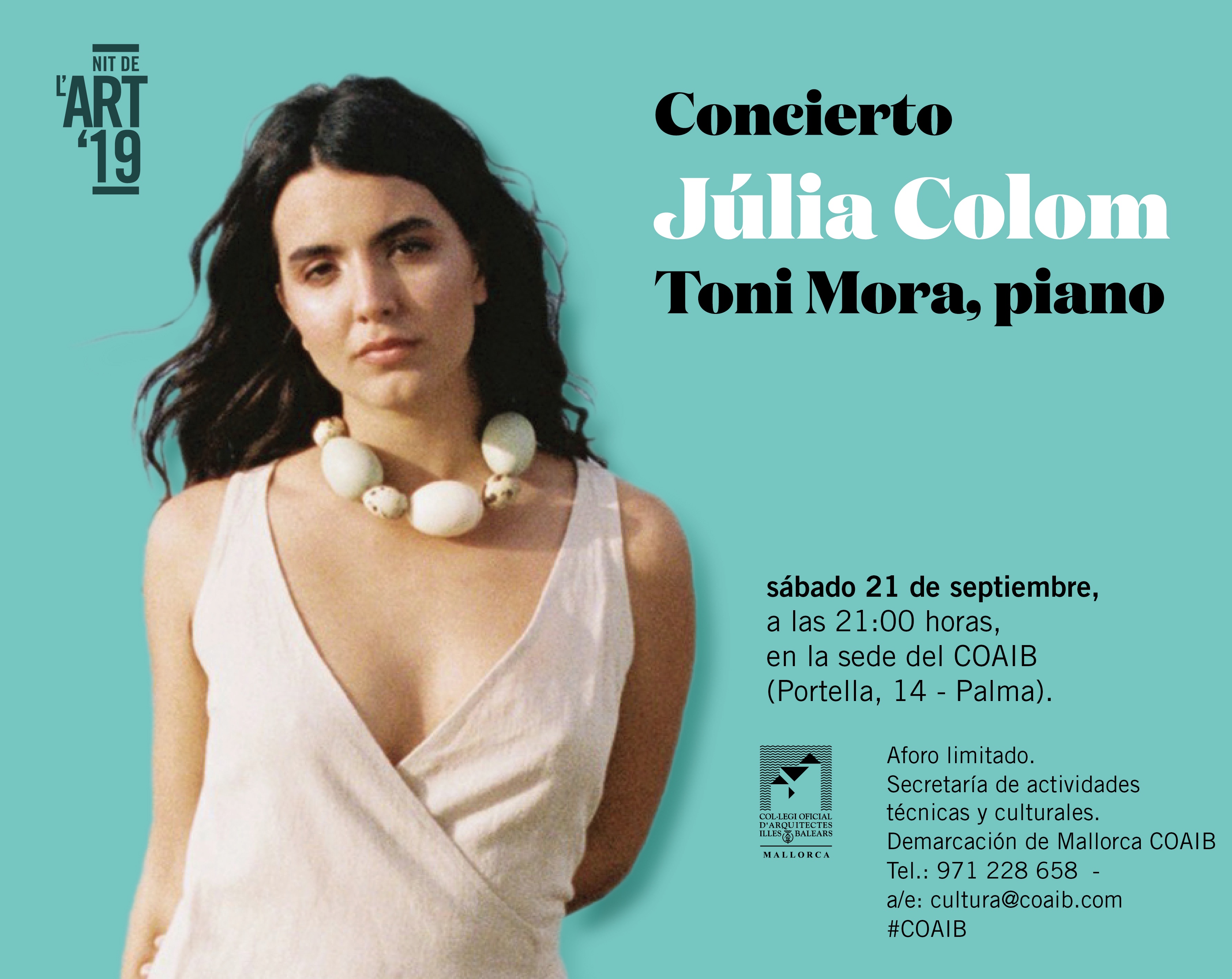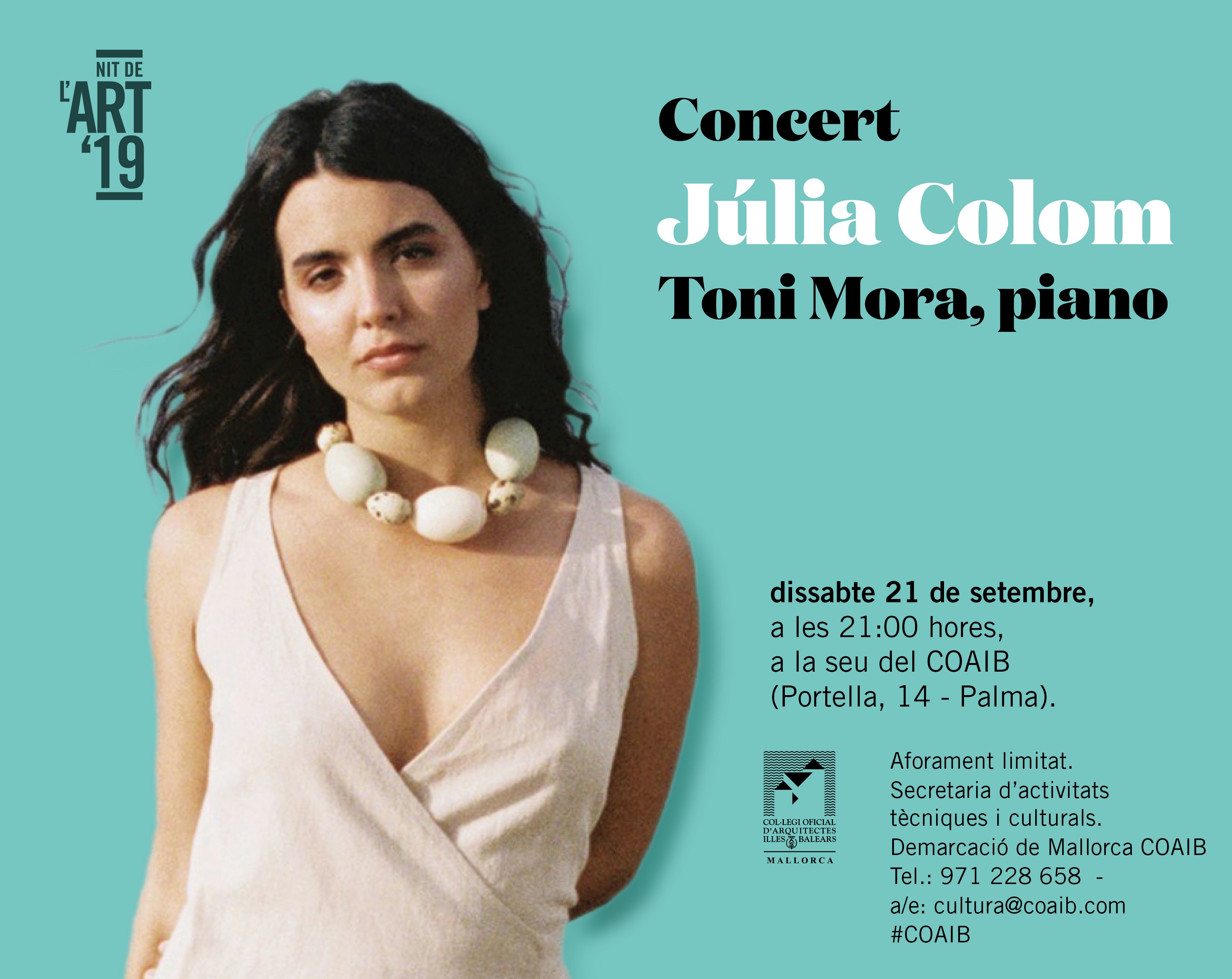 Con motivo de la participación del COAIB en la Nit de l’Art 2019, os invitamos al concierto de Júlia Colom, joven cantante y compositora mallorquina, que interpretará una selección de sus mejores temas, el sábado 21 de septiembre, a las 21:00 horas en el patio de entrada de la sede del COAIB (calle Portella, 14 – Palma).
