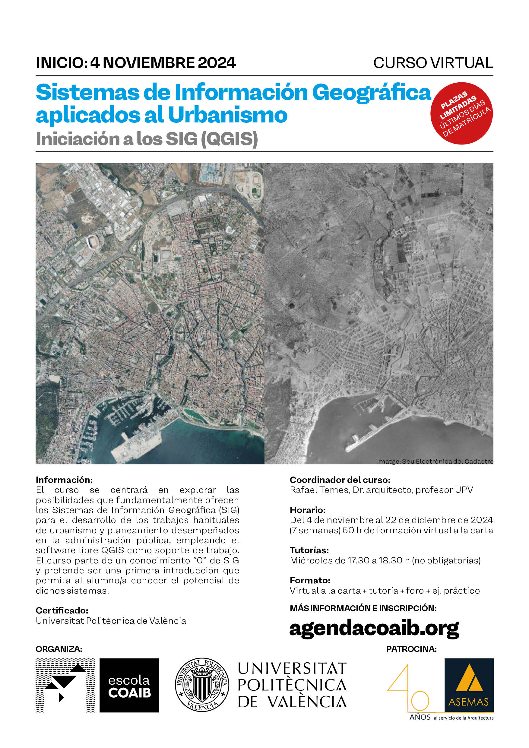 ¡ÚLTIMOS DÍAS DE MATRÍCULA! PLAZAS LIMITADAS. Nueva edición del Curso de Sistemas de Información Geográfica aplicados al Urbanismo. Iniciación a los SIG (QGIS). Del 4 de noviembre al 22 de diciembre de 2024