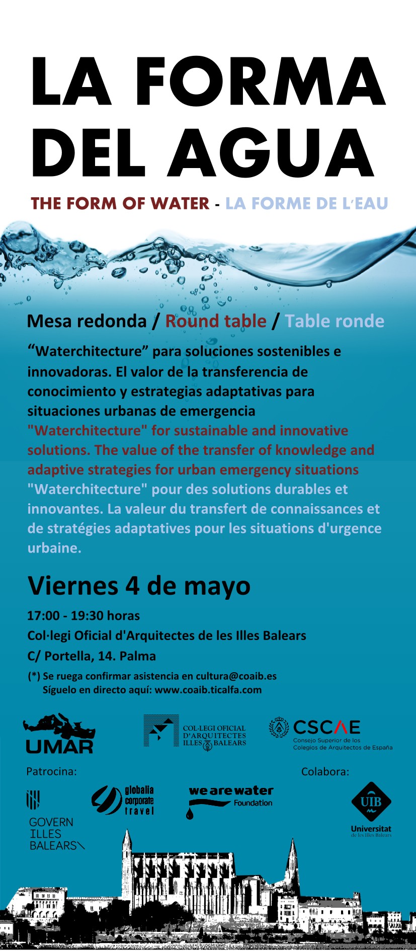 El Col·legi Oficial d’Arquitectes de les Illes Balears acoge cuatro ponencias y una mesa redonda, "La forma del agua. Waterachitecture", que se centra en el valor de la transferencia de conocimiento y estrategias adaptadas a situaciones urbanas de emergencia.