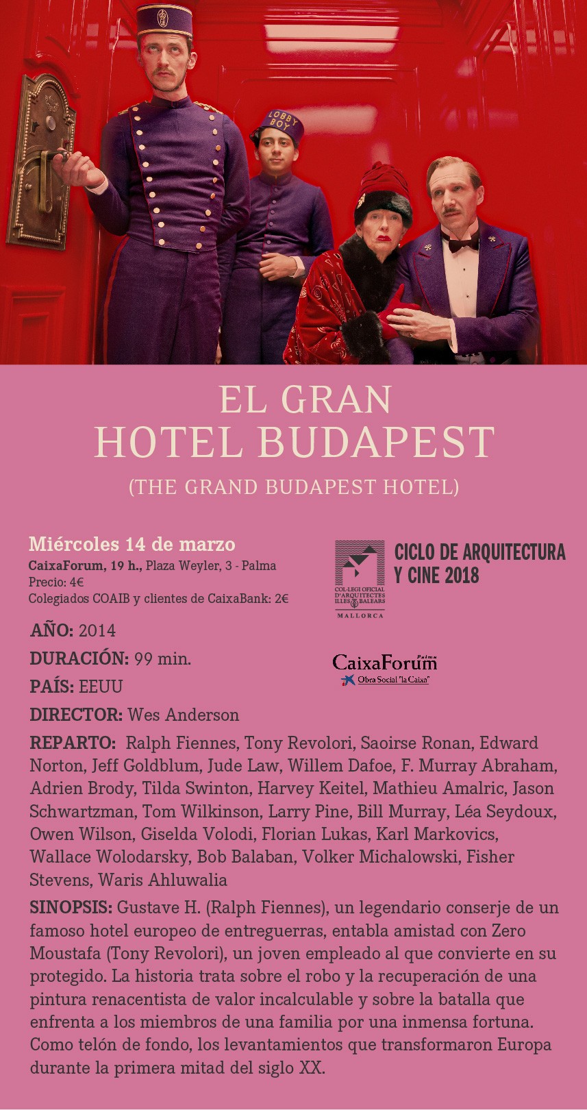 Ciclo 2018 “Ciclo de arquitectura y cine”. Periodicidad mensual. El gran hotel Budapest (The Grand Budapest Hotel). CaixaForum, miércoles 14 de marzo de 2018.