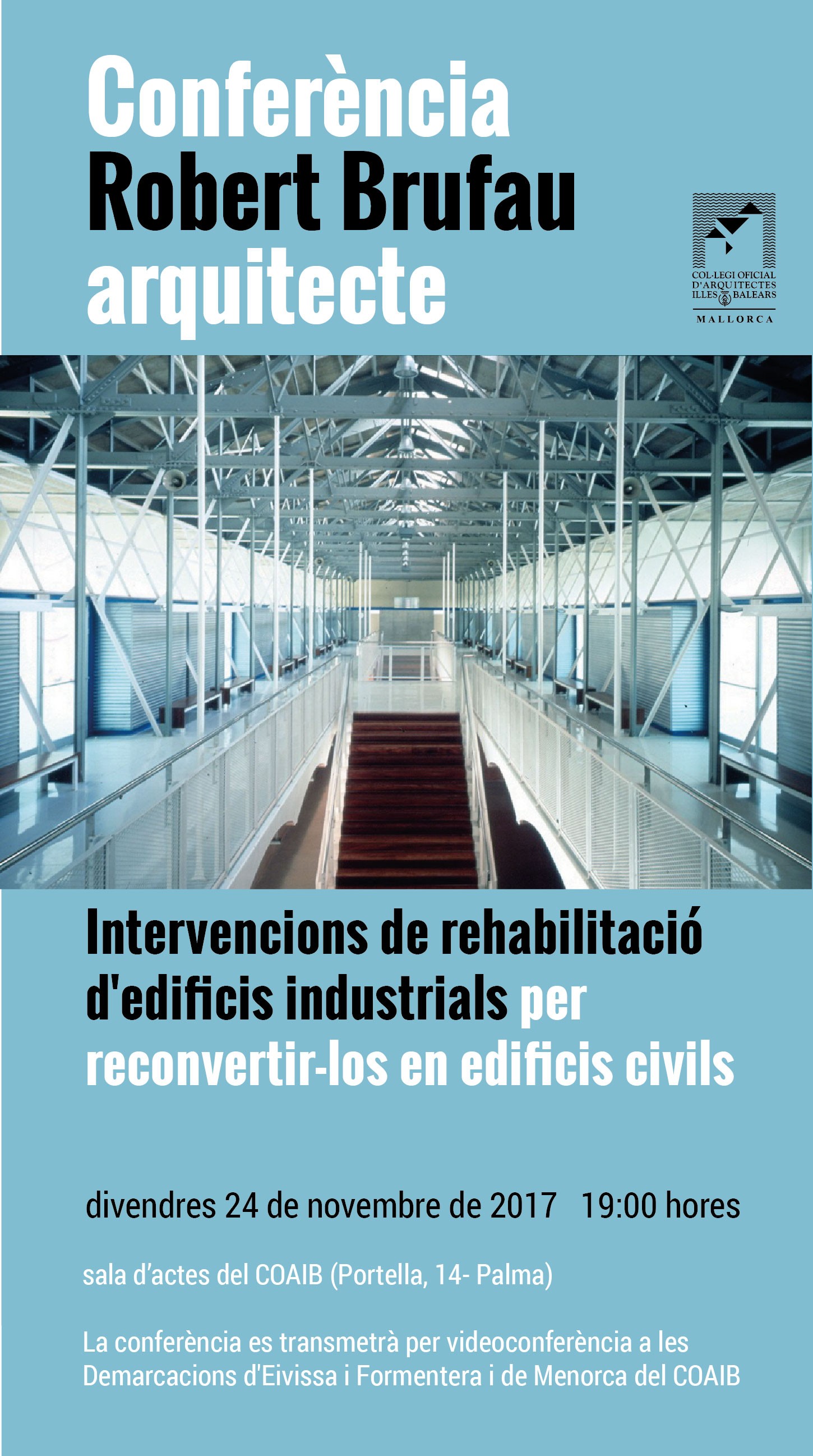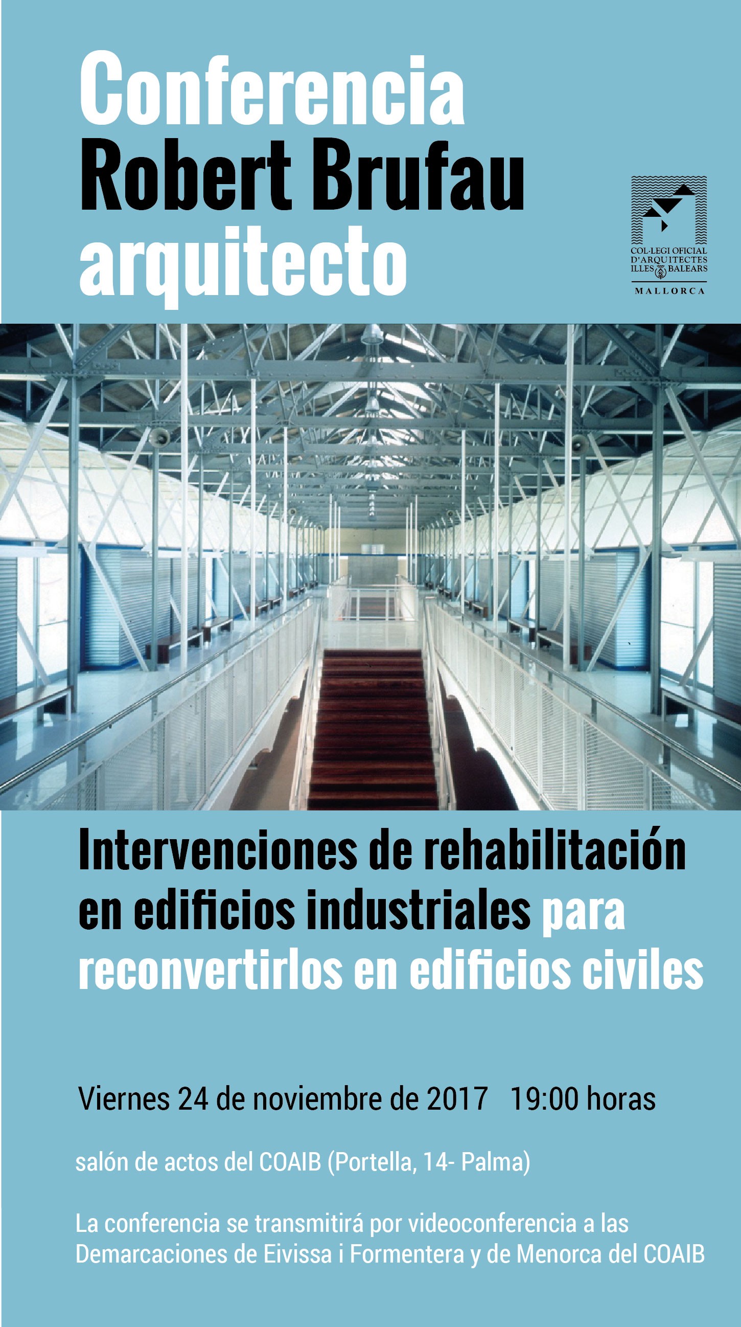 La Demarcación Mallorca del COAIB organiza la conferencia Intervención en edificios industriales para reconvertirlos en edificios civiles a cargo del arquitecto catalán Robert Brufau, y que tendrá lugar el viernes, 24 de noviembre de 2017, a las 19:00 horas, en el salón de actos de la sede central del COAIB (calle Portella, 14- Palma).