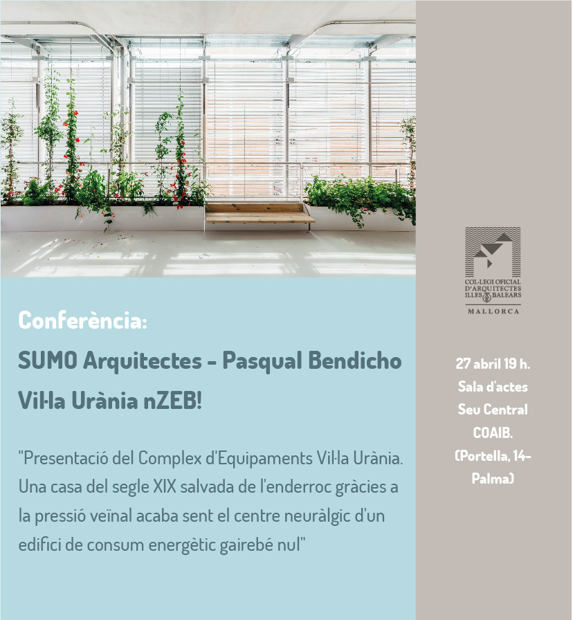 La Demarcación Mallorca del COAIB organiza la conferencia Vil·la Urània nZEB! a cargo de Pasqual Bendicho de SUMO Arquitectes que presentará el Complejo de Equipamientos Vil·la Urània. Una casa del siglo XIX salvada de la demolición gracias a la presión vecinal y que acaba siendo el centro neurálgico de un edificio de consumo energético casi nulo.