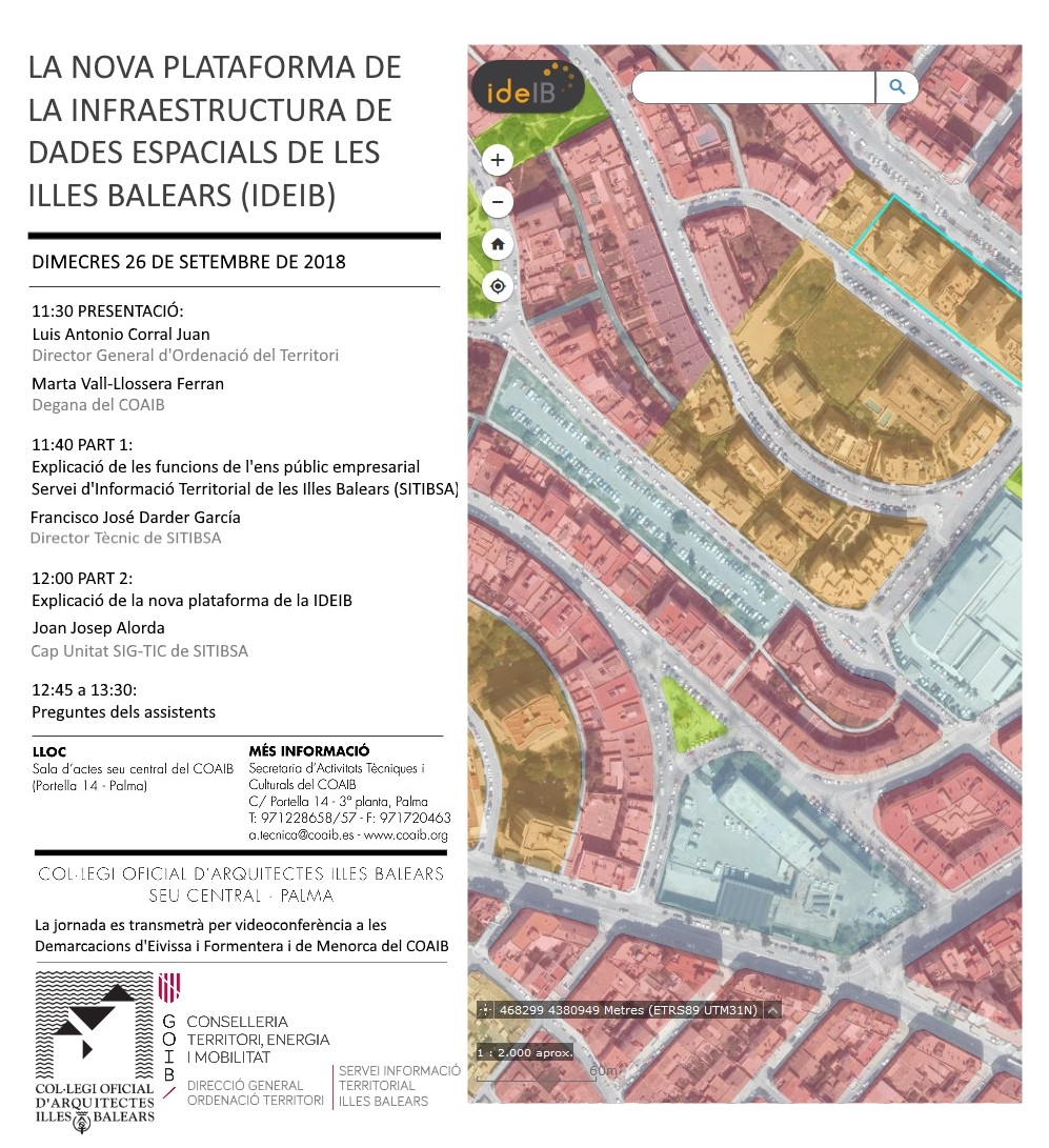 El COAIB, la Direcció General d’Ordenació del Territori del Govern de les Illes Balears y SITIBSA organizan una jornada de presentación de la nueva plataforma IDEIB, que se celebrará el 26 de septiembre de 2018, a las 11:30 horas, en el salón de actos de la sede central del COAIB (calle Portella, 14 – Palma), y con transmisión por videoconferencia a las demarcaciones de Eivissa i Formentera y de Menorca del COAIB.