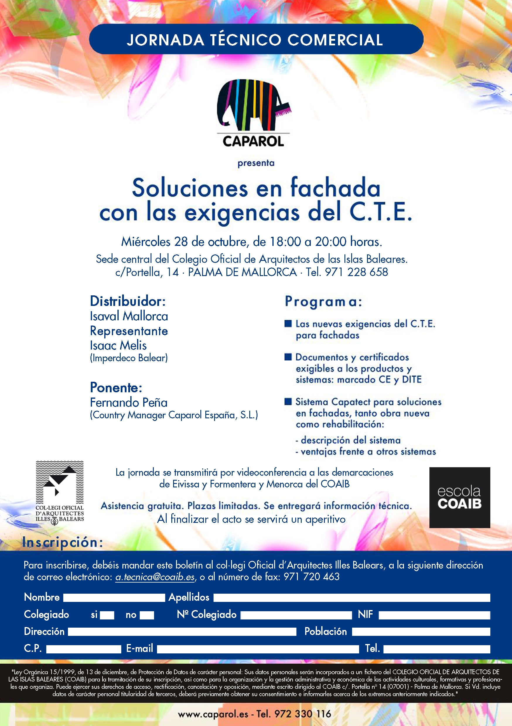 Para más información pueden dirigirse a la Secretaria de Actividades Técnicas y Culturales, (c/. Portella 14, 3ª Planta), tel.: 971.228670, e-mail: a.tecnica@coaib.es; www.coaib.es