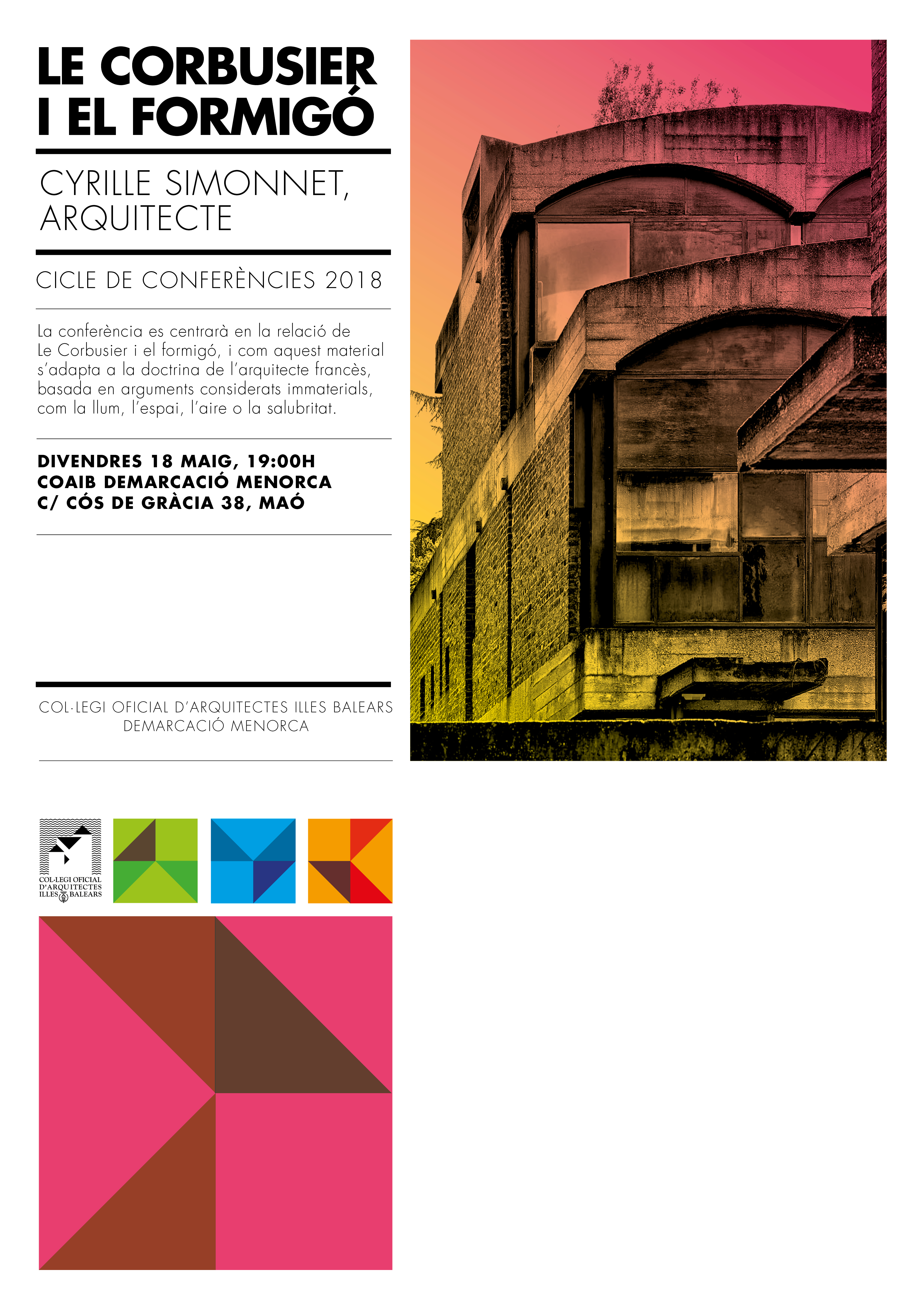 Ciclo de conferencias Demarcación Menorca 2018. Le Corbusier y el hormigón. Maó, 18 de mayo, a las 19 h.