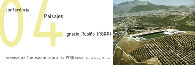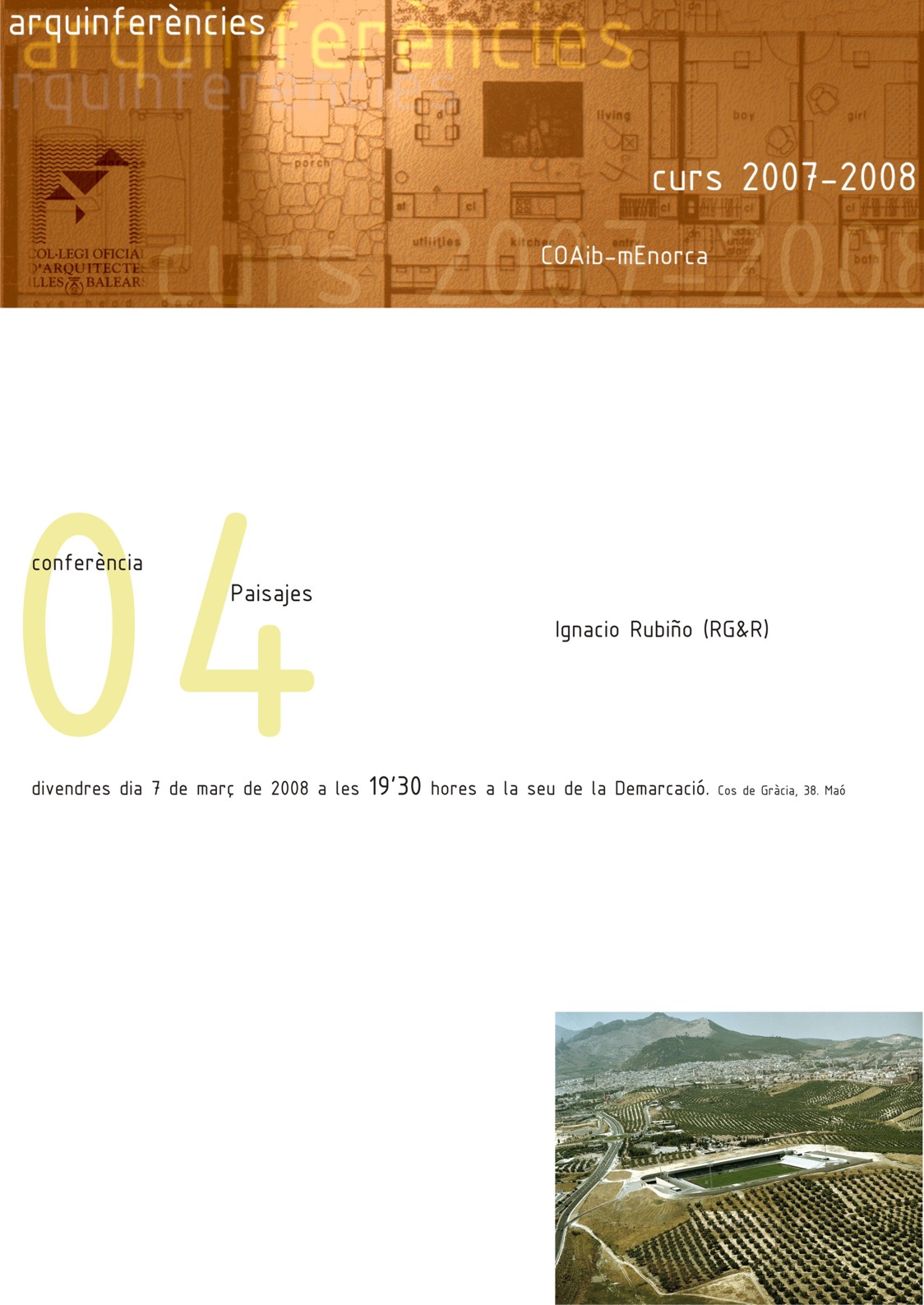 La Demarcación de Menorca del COAIB organiza, en el marco del ciclo de Arquinferències 2008, una conferencia a cargo de Ignacio Rubiño, del estudio de arquitectura RG&R, bajo el título "Paisajes".