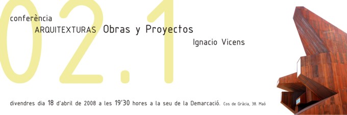 La Demarcación de Menorca del COAIB organiza, en el marco del nuevo ciclo de Arquinferències 2008, una conferencia a cargo del arquitecto Ignacio Vicens, bajo el título "Arquitexturas: obras y proyectos", la cual ya había sido convocada para el 25 de enero de 2008 y tuvo que ser suspendida (ver notícias 4979 i 5000).