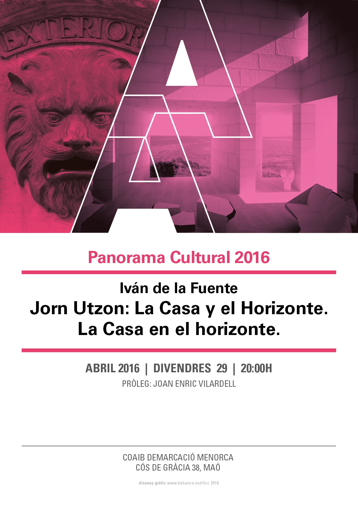 La Vocalía de Cultura de la Demarcación de Menorca del COAIB organiza la cuarta conferencia “Exterior” del “Panorama Cultural 2016” prologada por Joan Enric Vilardell y a cargo del arquitecto Iván de la Fuente quien, a raíz de su tesis sobre Jorn Utzon, explora, por un lado, la dualidad física subyacente entre la casa y el horizonte y, por otro lado, la presencia de la casa en el horizonte de su vida y de su obra, interpretando conceptualmente la casa como campo de investigación en arquitectura.