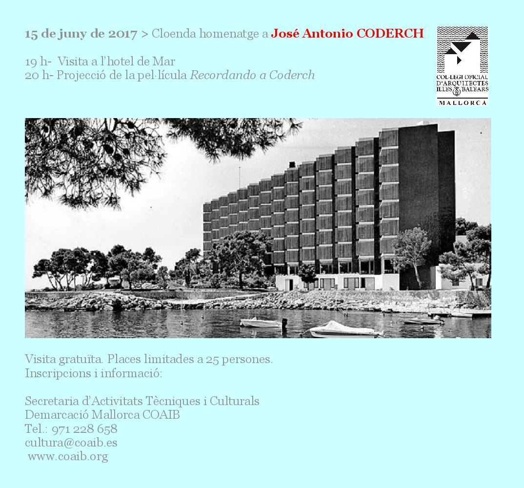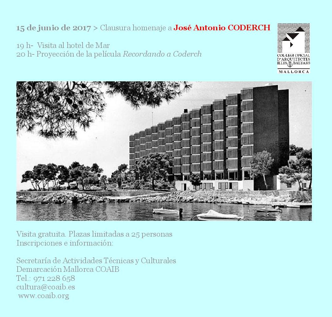 Esta visita se realizará el jueves 15 de junio de 2017, a las 19:00 horas. El punto de encuentro será la puerta del Hotel de Mar (Paseo de Illetes, 7). A continuación, a las 20:00 horas, se proyectará en el mismo hotel la película Recordando a Coderch.